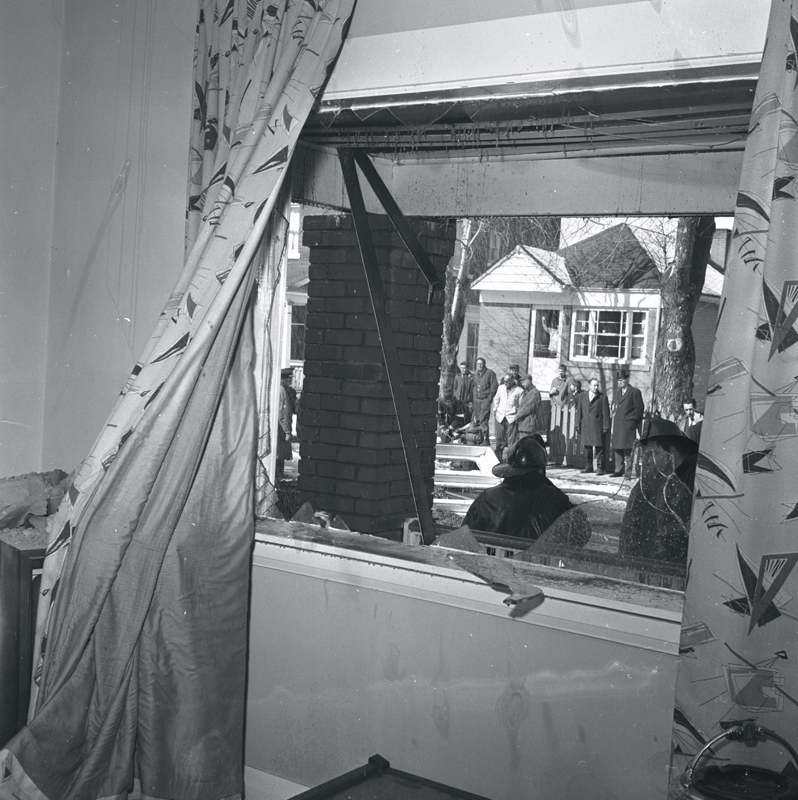 Image of broken house window, viewed from interior, with two firefighters and onlookers standing outside