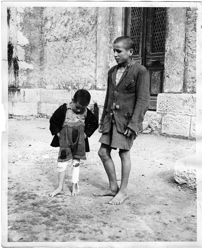 Image of two brothers, one with bandages around his legs posing for the camera. Annotation on reverse reads: "Yannis Katsoulas is seen taking his younger brother, Vangelis, to a Greek Community Clinic for treatment of his burned legs. Money is urgently needed to maintain these clinics and Canadians are being asked to subscribe $1,500,000 to the Canadian Relief to Greece Appeal to carry on this work."