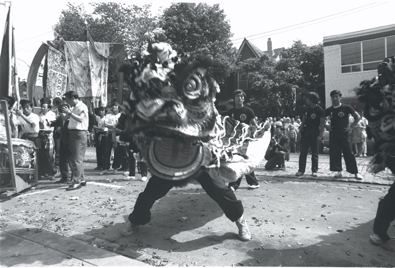 Image of Chinese lion dancer performing, with legs wide apart, in street with musicians playing percussion instruments and spectators standing nearby