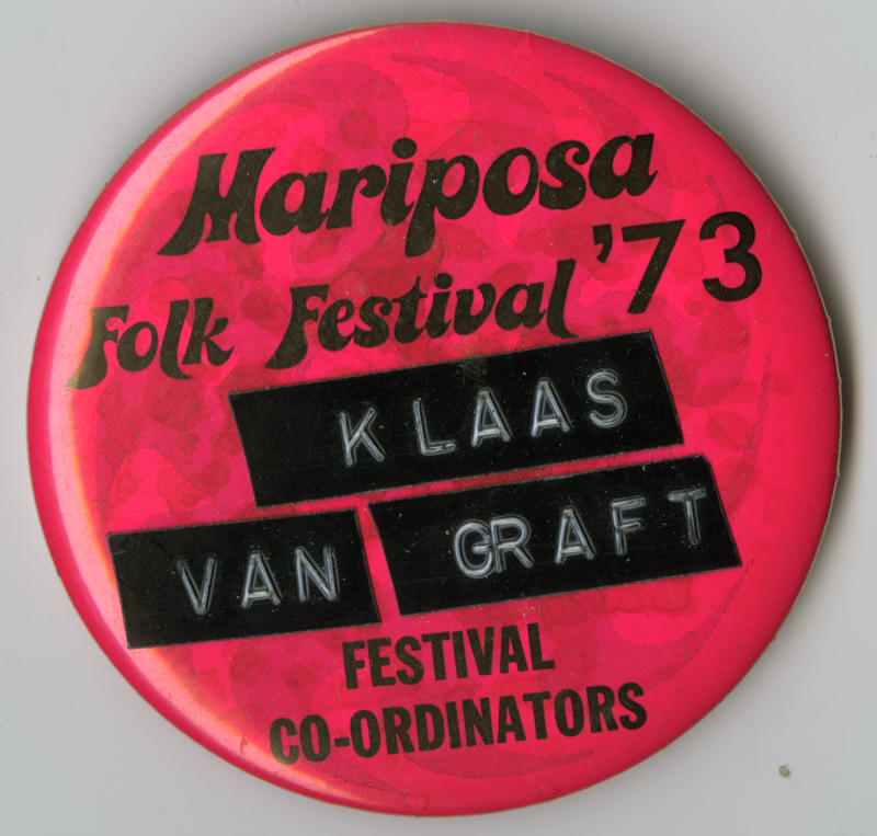 Item consists of one round, metal button in fushia with black, stylized text reading: "Mariposa Folk Festival '73" at the top. In smaller, bold uppercase text on the bottom, it designates: "Festival Co-ordinators". In the centre, stamped on with black labelling tape in white, embossed, uppercase text, reads the name: "Klass Van Graft".