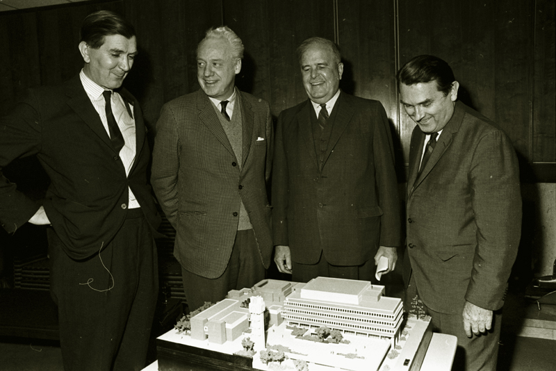 Image of Murrary Ross and three men examining a model of the Osgoode Law building.