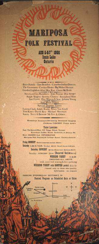 Item consists of a cardboard poster for the 1966 Mariposa Folk Festival. At the top of the long, vertical poster there is a circle of a flame pattern printed in orange, directly onto the natural cardboard. Within the circle, in stylized, western, large letters it reads "Mariposa Folk Festival" and in smaller, bold letters below: "Aug 5-6-7th 1966 Innis Lake, Ontario. Below the circle, centred text lists the acts: " Beers Family, Tom Brandon, Canadian Indian Dancers, The Gosvenors, Carolyn Hester, Big Walter Horton, Gordon Lightfoot, Alan MacRae, Owen McBride, New Lost City Ramblers, Tom Paxton, Pete Seeger, Staple Singers, Stormy Clovers, Sunnyland Slim, Ian Tyson, Doc Watson & Son, Johnny Young, And Many Others" It goes on to list "Special Daytime Guests: Lorena Clark, Edith Fowke, Klass Van Graft, Tom Kines, David Rea, Michael Sherman, Sonny Terry & Brownie McGee & Others." Below there is more text providing further information about the festival: "Workshops, Seminars, Swimming, Restricted Camping, Childrens Concert, Picnic Areas. Ticket Locations: Sam The Record Man, 347 Yonge Street, Toronto; Riverboat Coffeehouse, Yorkville and Avenue Road; Mail Orders and Information: Mariposa Folk Festival, 20 College Street, Toronto, Ontario. Friday Concert $3.00 (reserved section $3.25). Saturday Grounds ticket $2.00, good 10 am - 5:30 pm. Saturday Concert $3.50 (reserved section $3.75). Sunday Concert $2.50 (reserved section $2.75). Weekend ticket $10.00 (Includes all above with reserved seating and free parking). Weekend ticket with camping permit $12.50 (Issued only to those who qualify. Information on Request). Parking Evenings $1.00, Daytime .50. Festival program as scheduled rain or shine." Below the text there is a simple, line-drawn map explaining how to get to Innis Lake. Bordering the bottom of the poster is an orange and black expressionistic line-drawing showing festival merriment as represented by tents, flags and piles of instruments. Central to the drawing are three men who all appear to be singing. The man on the left is playing a banjo and the two men to the right are playing guitars.