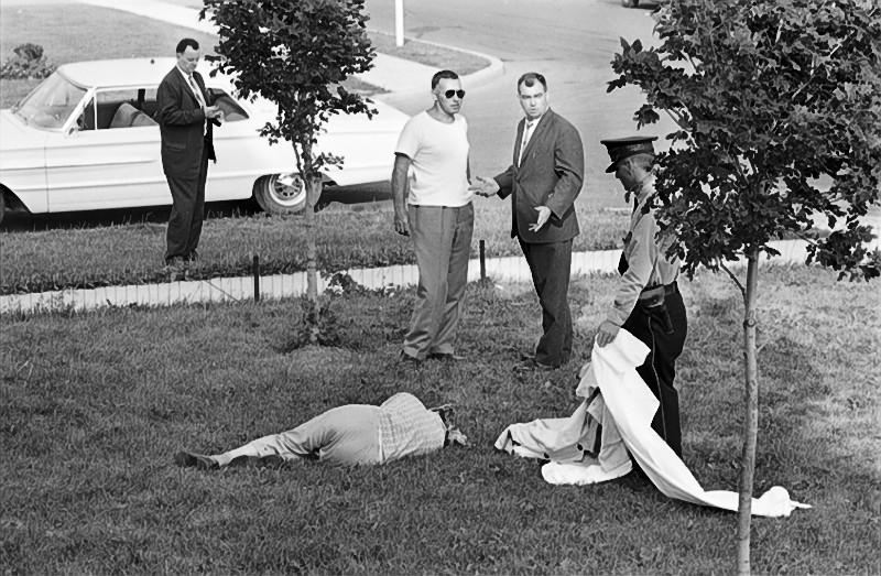 | dc.description | Image of men and policeman holding white sheet standing beside body lying on grass. | en_US |