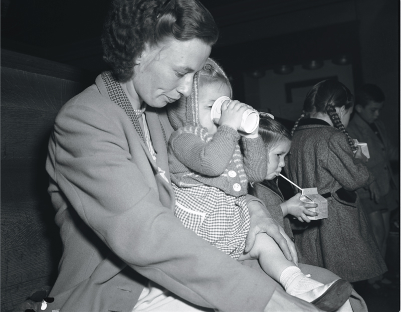 Image of child, wearing knitted pullover with hood and drinking from paper cup with both hands, sitting in woman's lap, near two girls drinking beverages in cartons with straws