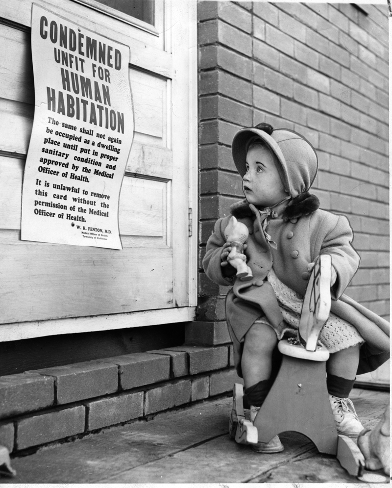 Image of toddler, Barbara Weidner, outside the door to a house on Gilhaven Avenue that has been condemned by the Medical Officer of Health. [shows mark up lines by Telegram photo editor]