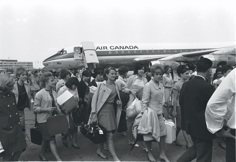 Image of large group of women carrying luggage and walking on runway tarmac near aircraft marked "Air Canada"