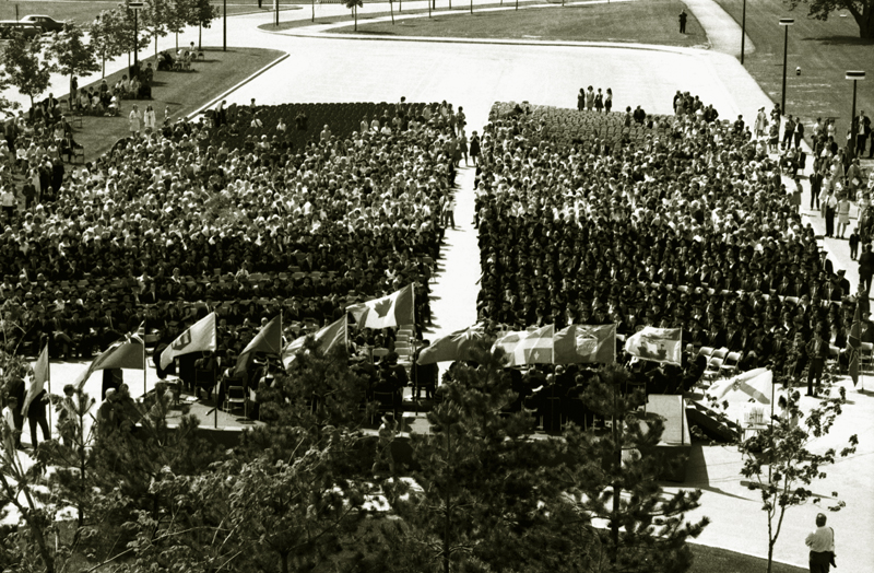 Aerial view of convocation ceremony taken from the roof of the Ross Building