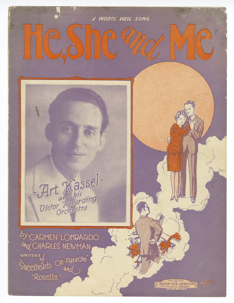 Man and woman embracing , clouds , man at gate ; Art Kassel (photograph) [illustration]