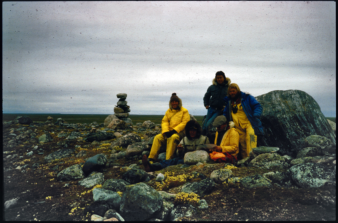 Researchers Robert Jefferies, Peter Kotanen, Dick Kerbes, Peter and Paul Mekiuniak, at the top of the esker of the McConnell River, which drains into the Hudson Bay at Kivalliq region in Nunavut territory.
