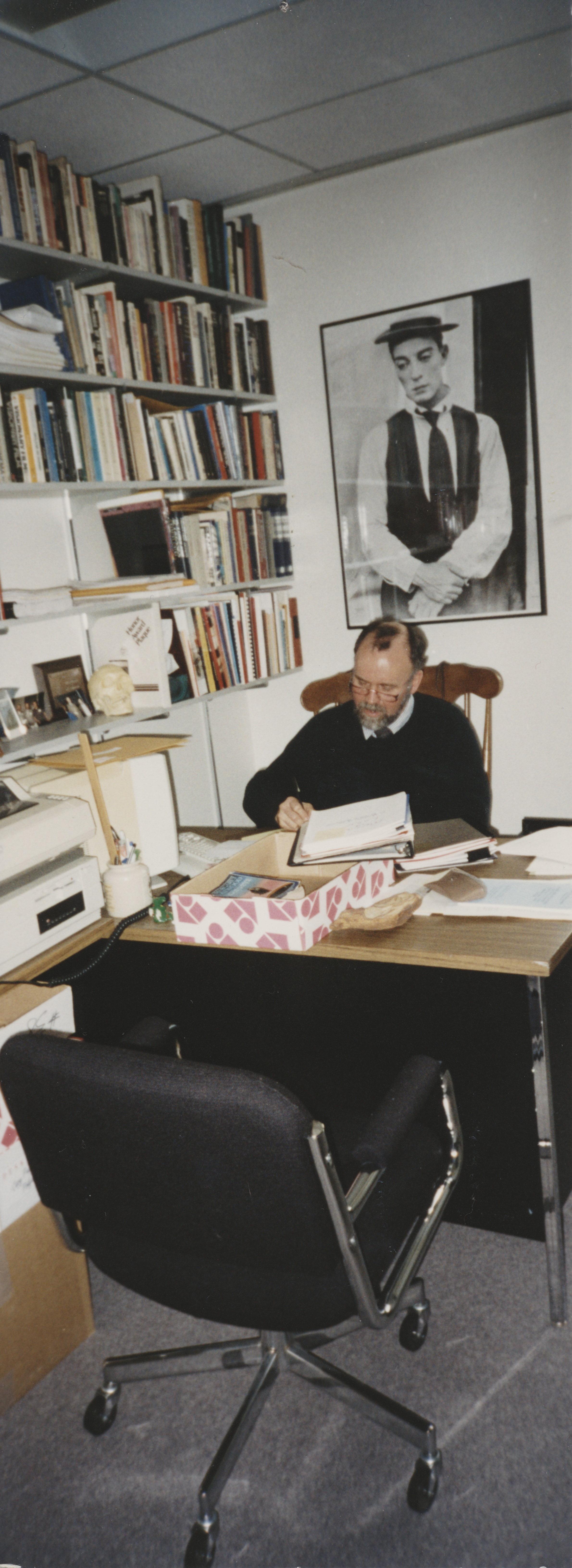 Photograph by Joan Evans of EWC assessing screenplays of students in the spring of 2001 within his office in the Film Department, Faculty of Fine Arts, York University, overseen by Buster Keaton.
