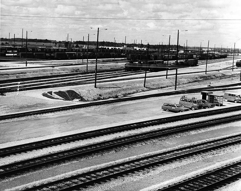 Image of CN rail yard with CN freight cars and automobiles all bearing the CN logo created by Allan Robb Fleming.