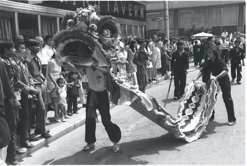 | dc.description.abstract | Image of Chinese lion dancer performing in street with spectators standing on sidewalk ; street sign "Hagerman St." in background | en_US |