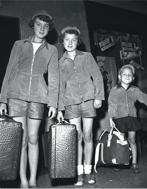 Image of two girls, wearing matching caps, shorts, and zippered jackets, carrying matching luggage in right hands, standing to the right of boy wearing similar jacket and carrying luggage in his right hand