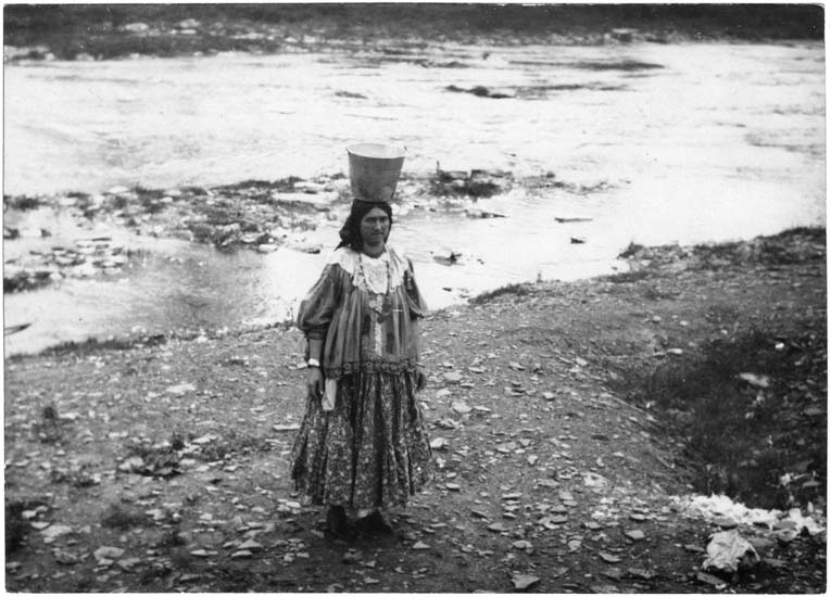 Roma woman carrying water at camp on the Humber River