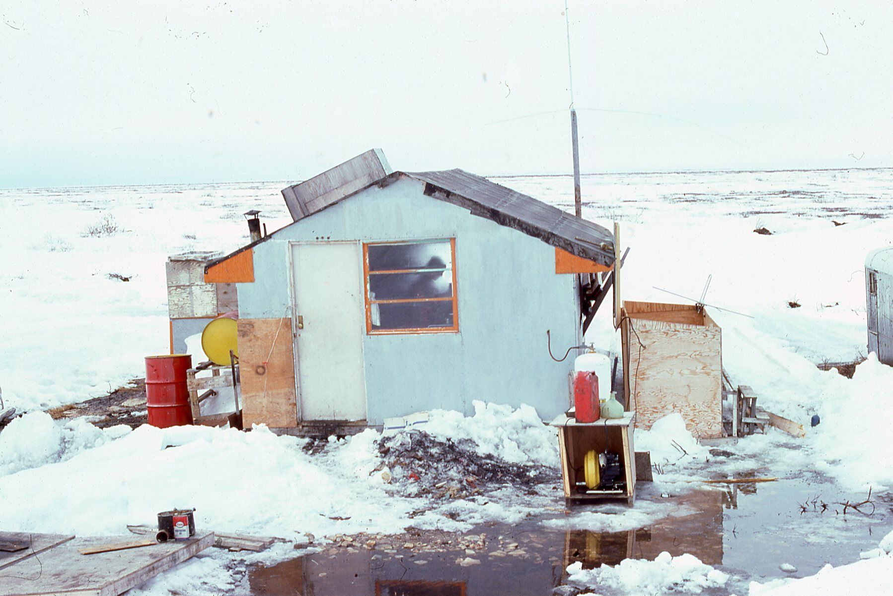 Cooke Shack. This Cooke Shack was named for Fred Cooke and its name was a double entendre because it was also where the group did all our cooking. It was the group's only building in the spring of 1976, aside from the tin trailers that can be seen in the August aerial image labeled Camp Finney. The group erected the Quonset hut between hatch monitoring and banding in the summer of 1976.