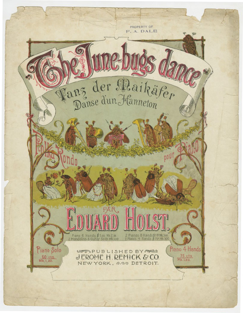 Cartoon junebugs playing instruments and dancing [illustration]
