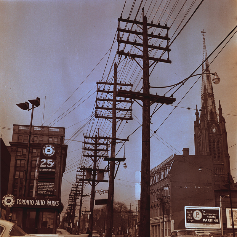 dc.description.abstract | Image of hydro poles and wires above street comer with building sign on one corner marked "Toronto Auto Parks, 25¢, 75¢ maximum" and "P: Look for this sign for convenient thrifty parking" on the other ; Cathedral Church of St. James in background | en_US |