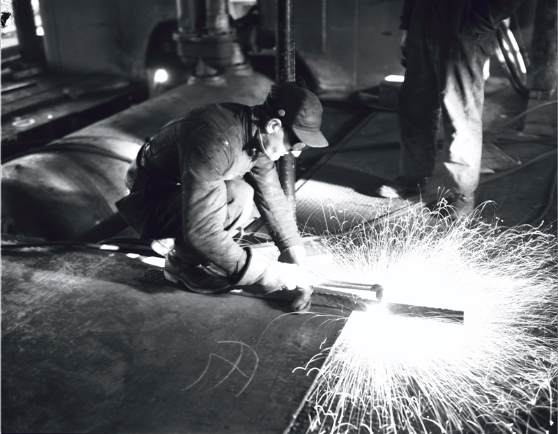 Image of two men in coveralls welding on "Cayuga" ship