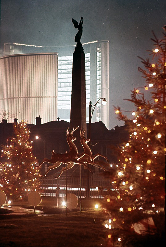 Image of Canada Life Christmas reindeer in foreground and new City Hall in background [Nathan Phillips Square]