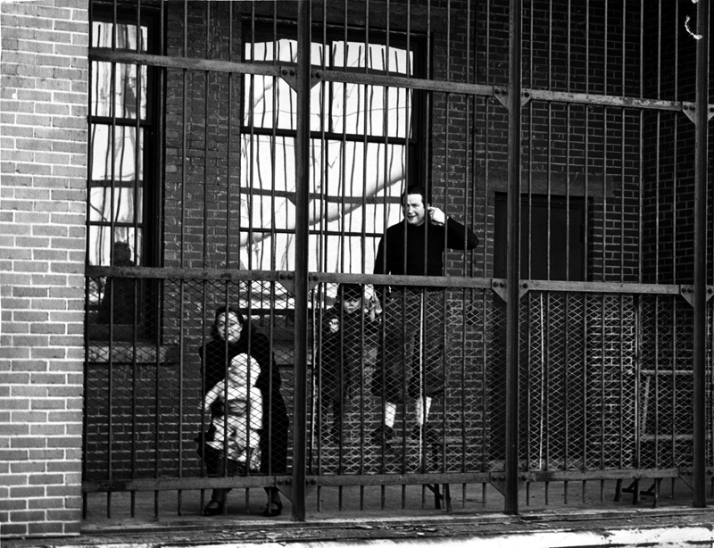 Image of man and woman with two children standing behind detention bars in Halifax. Caption reads: "Immigrant family through detention bars at Halifax."