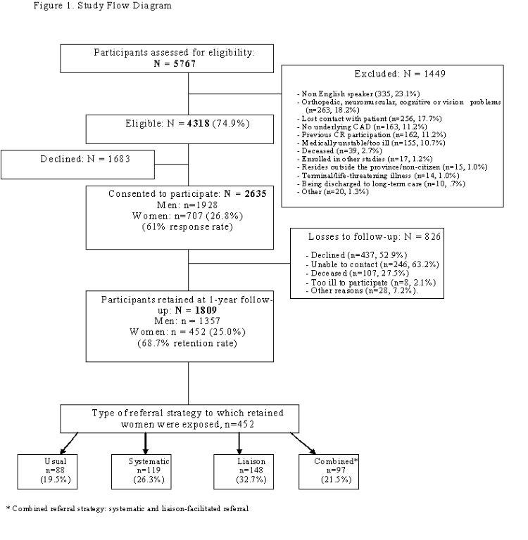 Background: Despite its proven benefits and need, women’s access to cardiac rehabilitation (CR) is suboptimal. Referral strategies, such as systematic referral, have been advocated to improve access to CR. This study examined sex differences in CR referral and enrollment by referral strategies; and the impact of referral strategies for referral and enrollment concordance among women. Design: Prospective cohort study. Methods: This prospective study included 2635 coronary artery disease inpatients from 11 Ontario hospitals that utilized 1 of 4 referral strategies. Participants completed a sociodemographic survey, and clinical data were extracted from charts. One year later, 1809 participants (452 [25%] women) completed a mailed survey that assessed CR utilization. Referral strategies were compared among women using generalized estimating equations to control for effect of hospital. Results: Overall, significantly more men than women were referred (67.2% and 57.8% respectively, p<.001), and enrolled in CR (58.6% and 49.3% respectively, p=.001). Of the retained women, combined systematic and liaison-facilitated referral resulted in significantly greater CR referral (Odds Ratio [OR]=10.3, 95% Confidence Interval [CI] = 4.11-25.58) and enrollment (OR=6.6, 95% CI = 4.34-9.92) among women when compared to usual referral. Conversely, concordance between referral and enrollment was greatest following usual referral (=.85), and decreased with referral intensity. Conclusions: While a lower proportion of referred patients enroll, systematic and liaison-facilitated inpatient referral strategies result in the greatest CR enrolment rates among women. Such strategies have the potential to improve access among women, and reduce “cherry picking” of patients for referral.