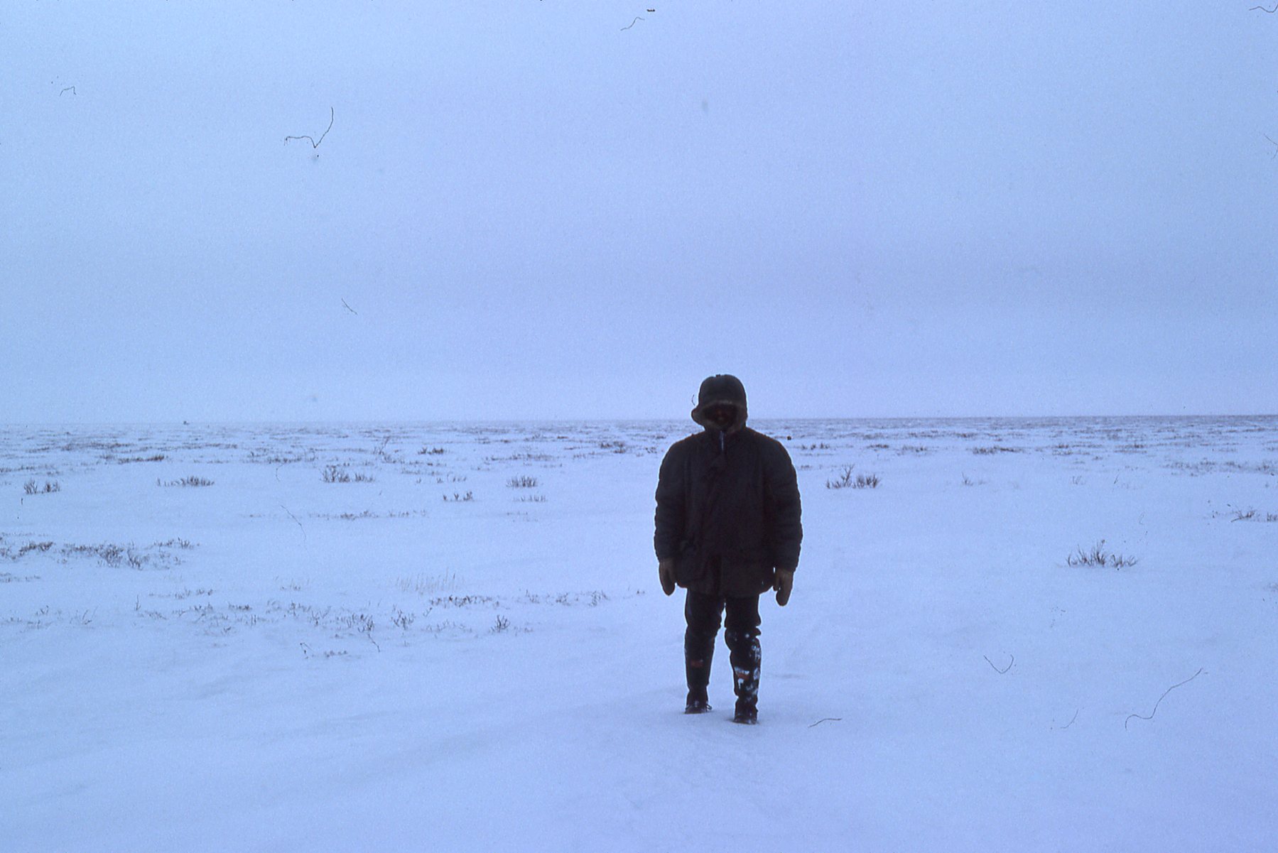 Ken Abraham standing in the snow at the camp Finney grounds in winter in Churchill, Manitoba, 1976.