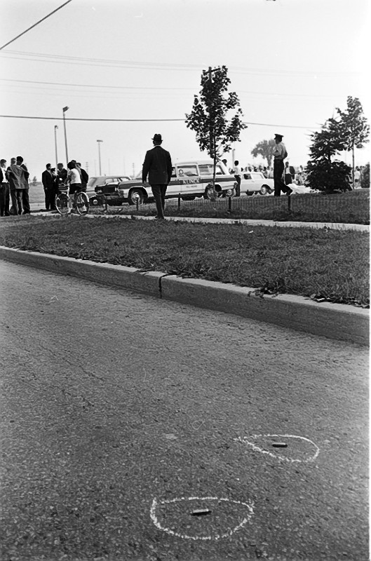 Image of two circles drawn on street with chalk and people on sidewalk standing near police car.