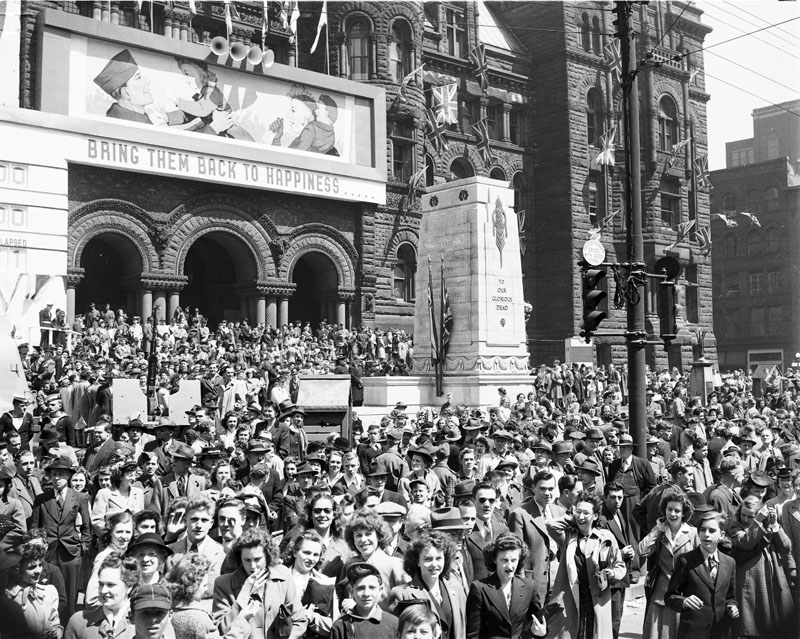 Image of crowds of people filling a square. A monument in the center outside of Toronto's Old City Hall "To Our Glorious Dead" and a sign that reads "Bring them back to happiness…"