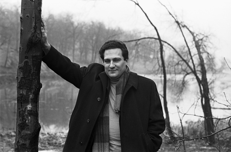 Image of John Robert Columbo outside in a park with his right hand resting on a tree trunk.