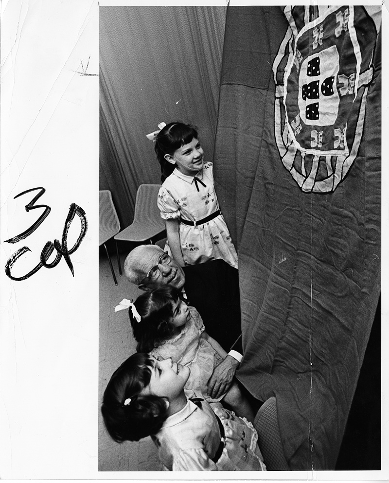 Image of 3 children and an elderly man looking at a Portugese flag.