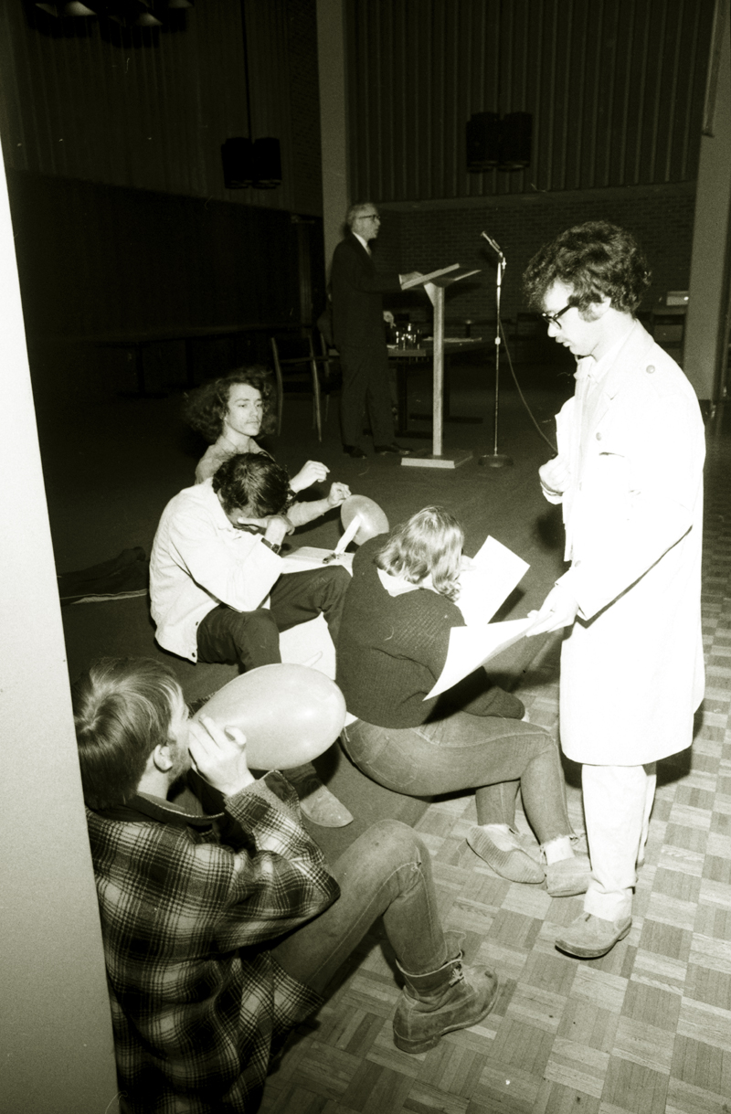 | dc.description | Image consists of students sitting on platform blowing up balloons in protest at reception for Frederick W. Minkler | |
