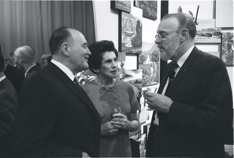 Image of woman and two men talking, holding cocktail glasses, and standing near wall with artwork displayed