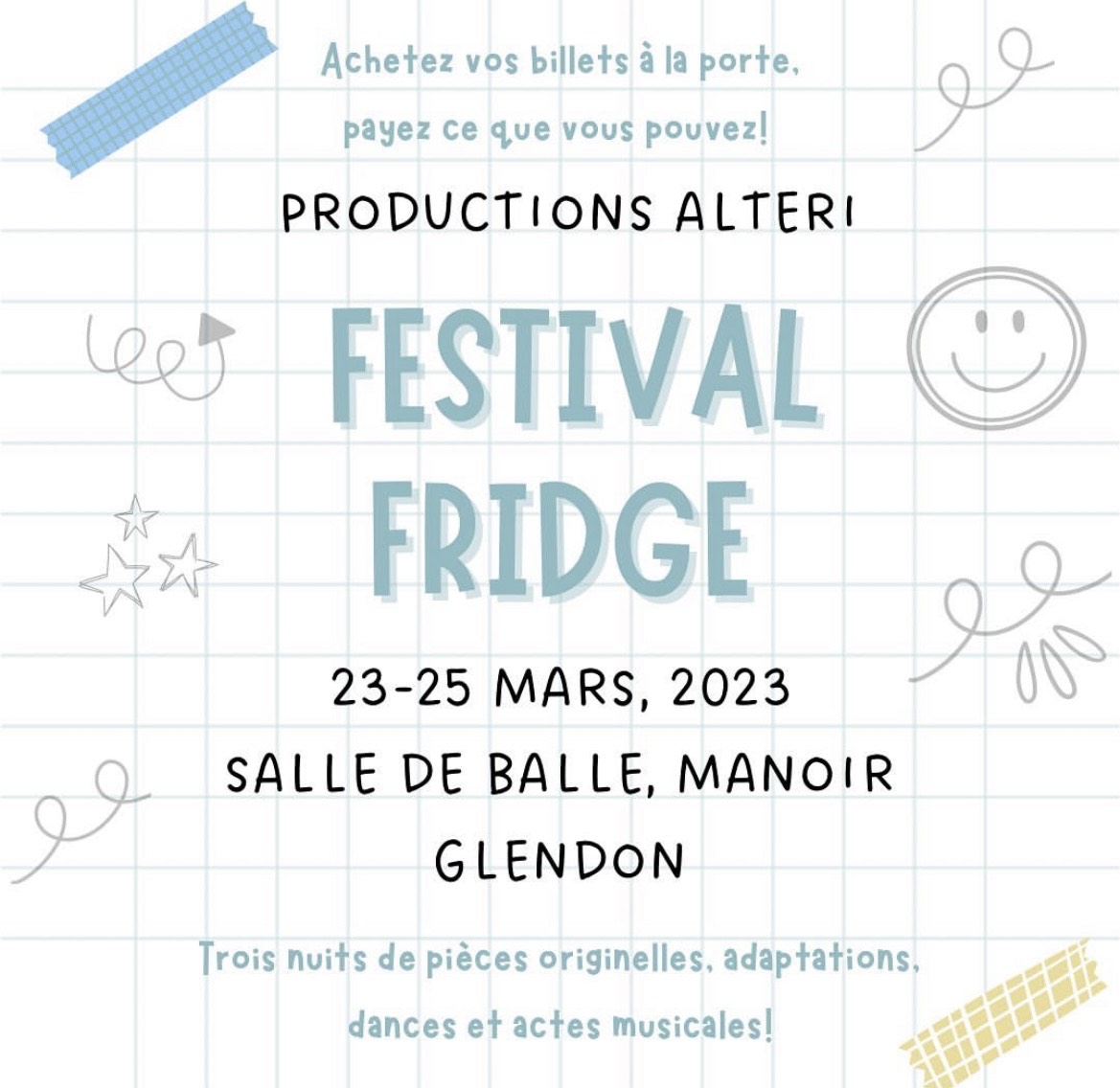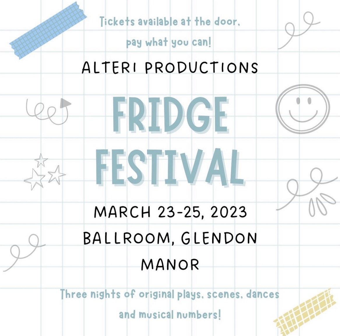 The archival file of Alteri Production's annual "Fridge Festival". The festival showcases various plays, songs, dances, etc. from student writers and directors. This festival ran from March 23-25th 2023