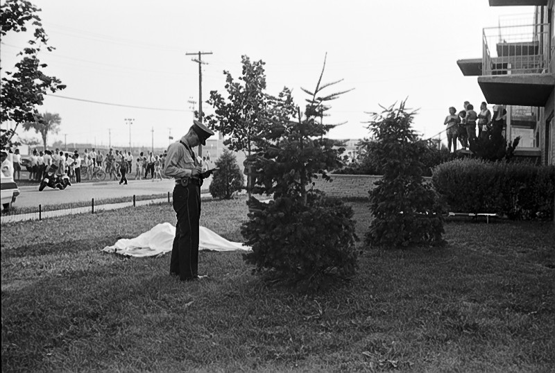 Image of police officer standing beside object covered with white sheet on lawn with group of people standing in background across the street.