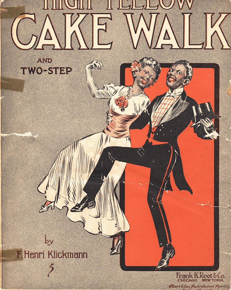 African-American couple in formal attire performing in a cake walk. [illustration]