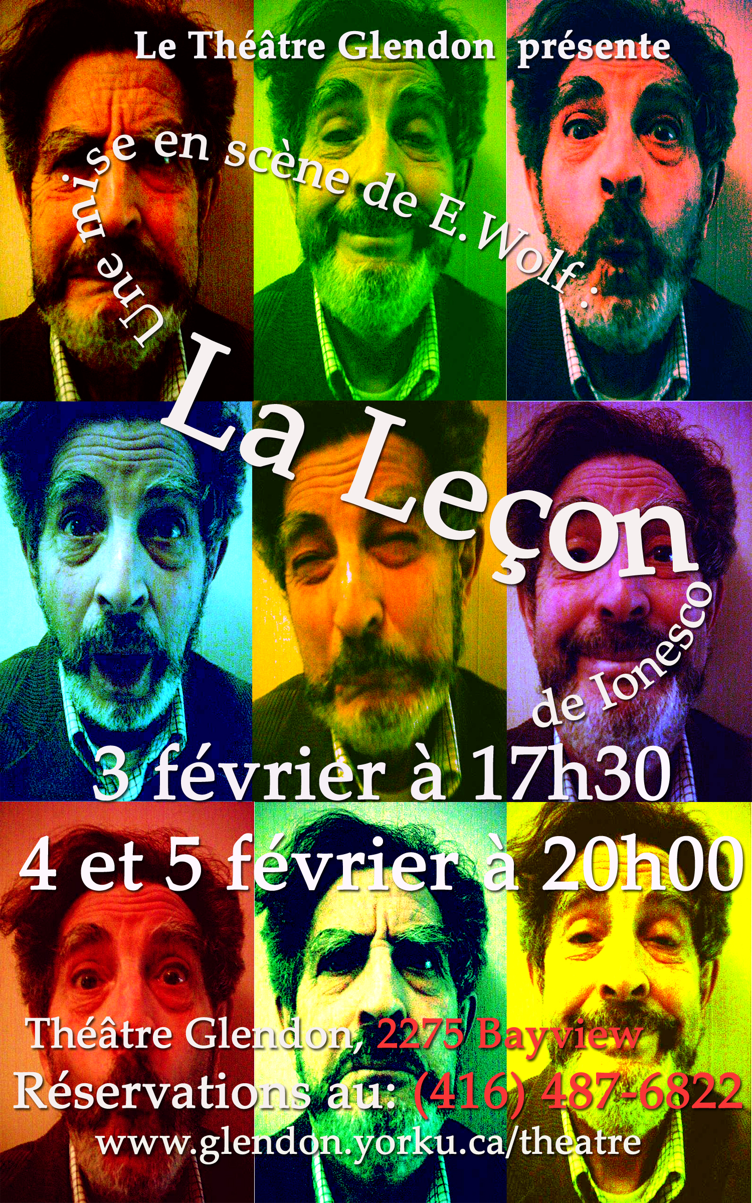 Archival file for the Glendon College production of Eugene Ionesco's La Leçon, directed by Esther Wolf. The play was performed March 3rd - 5th, 2005.
