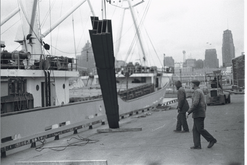 Image of two men wearing winter clothing on dock, watch as crane on ship lifts four metal I-beams; Toronto skyline in background