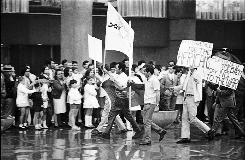 Image of Portugese protesters marching with spectators looking on.