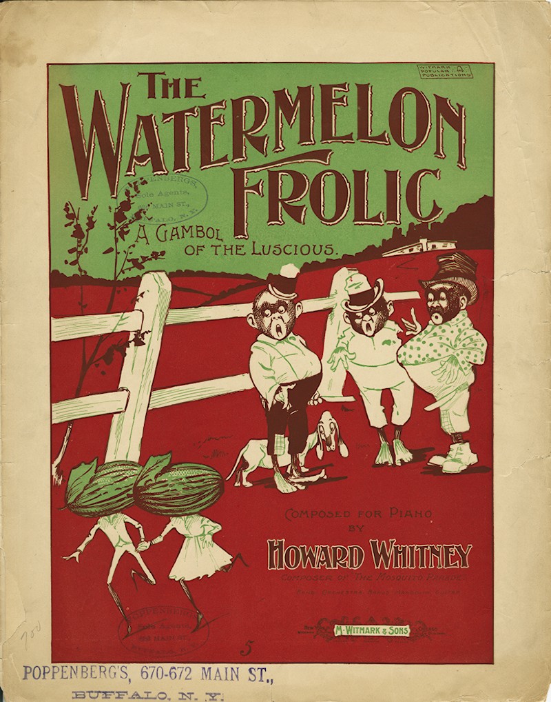 African-American caricature ; watermelons, men, dog, fence [illustration]