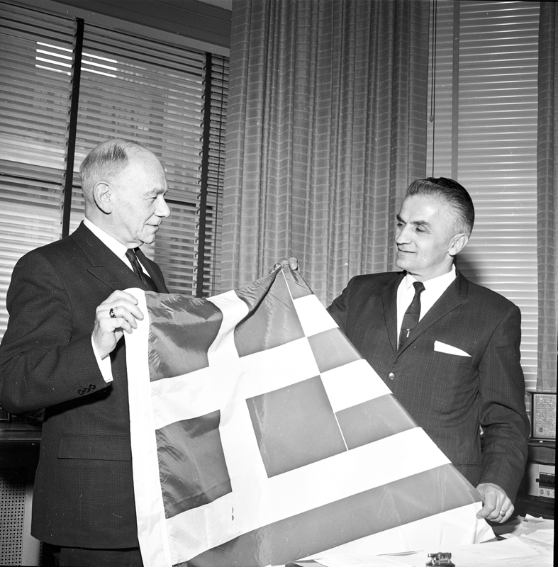 Image of two men holding up a Greek flag in an office setting. Description reads "Greek Independence Day delcaration in mayors' office at city hall."