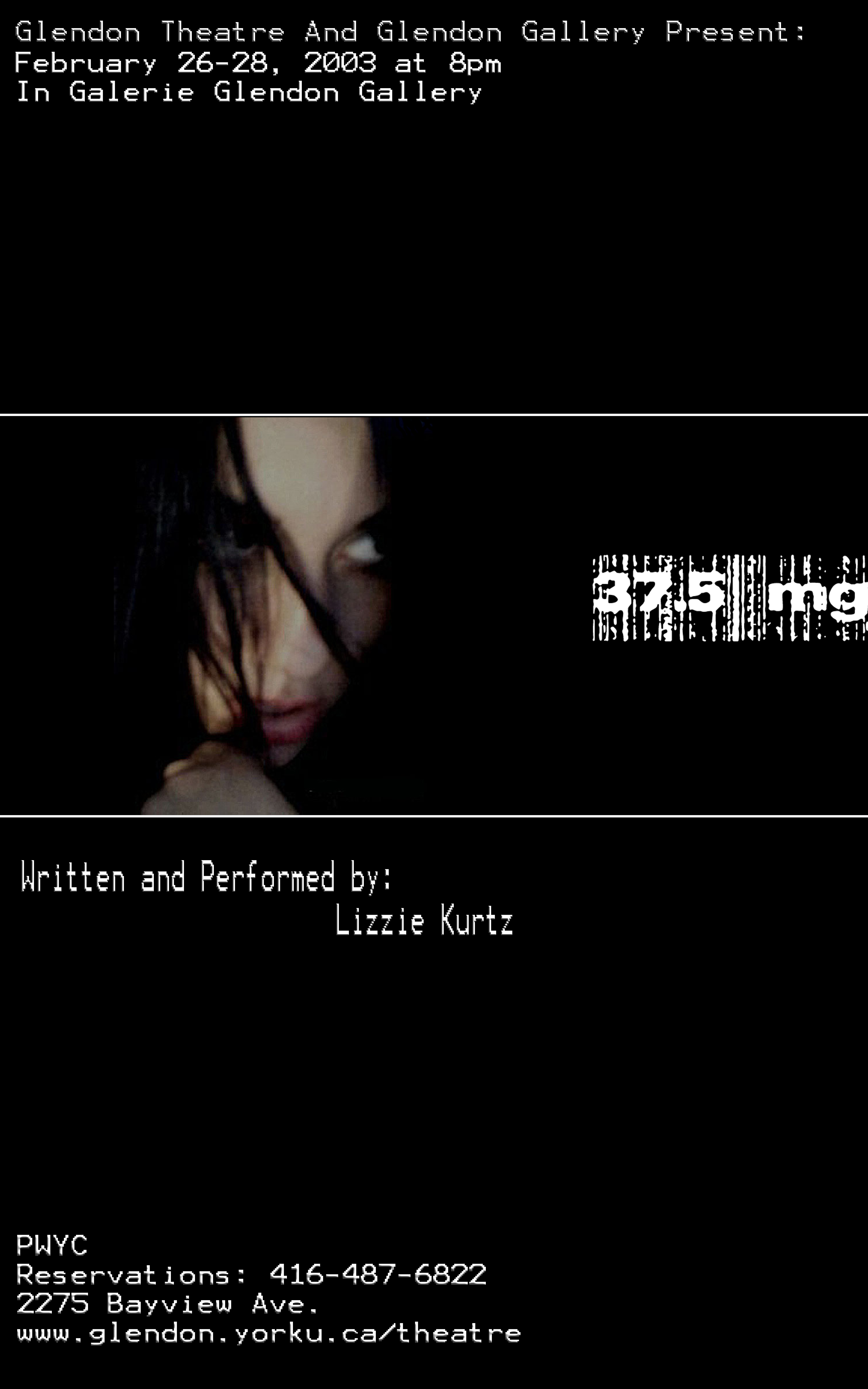 Archival file for the Glendon College production of Lizze Kurt's 37.5 mg, directed by Lizzie Kurt. The play was originally perfromed February 26th - 28th, 2003.