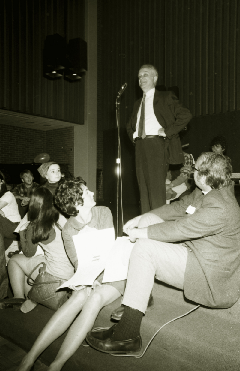 Image of man standing with hands on hips in front of microphone with students gathered around his feet