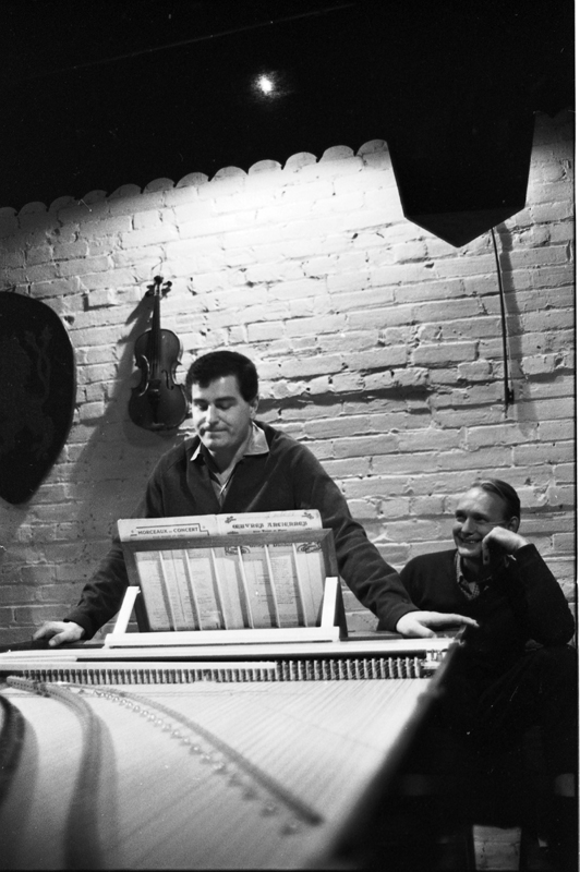 Image [portrait orientation] of a man standing at a piano, his hands either side of the music stand; another man looks on.