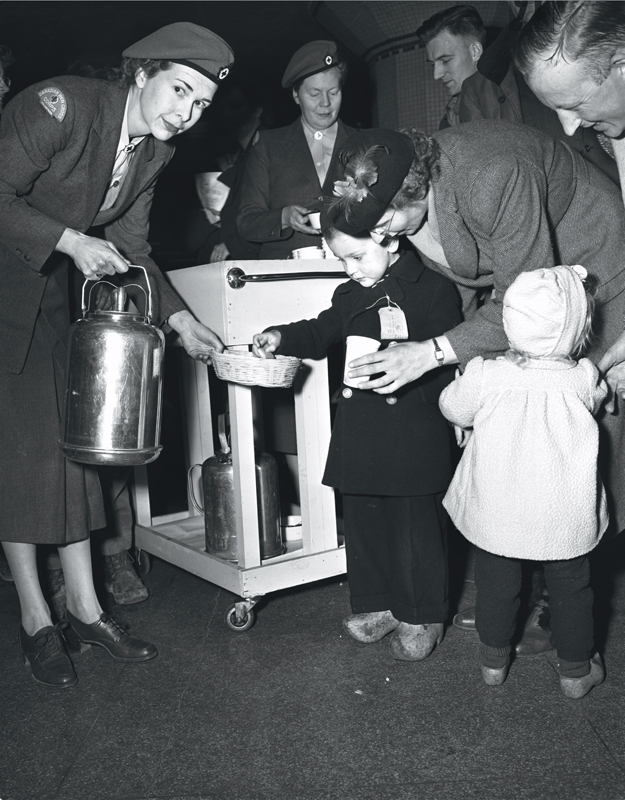 Image of two women wearing Red Cross uniforms giving food and beverages to group of people, including child, wearing clogs and overcoat with tag attached to label