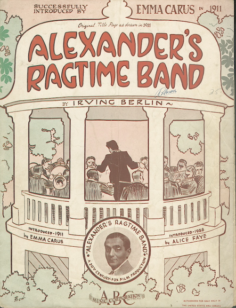 Orchestra in park, portrait of Irving Berlin. [illustration]