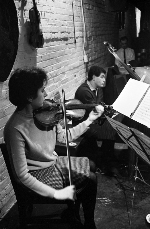 Image [portrait orientation] of a woman playing violin in left foreground and a man playing piano in background.