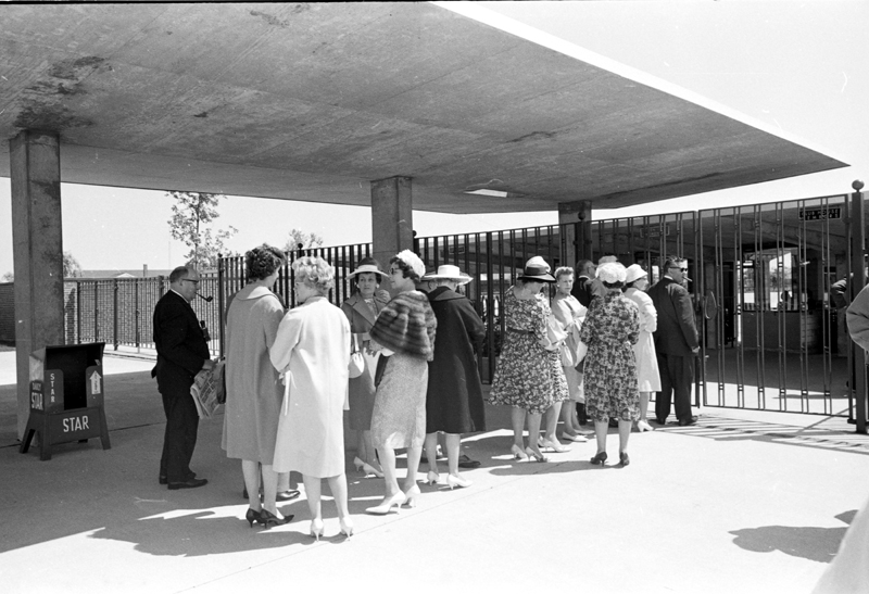 Image of people waiting in line at gate to enter New Woodbine Racetrack.
