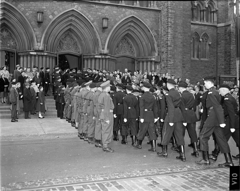 Image of soldiers in uniform marching into a building with arches flanked by soldiers stading at attention.