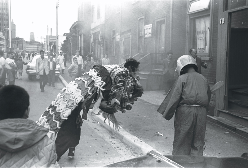 Image of Chinese lion dancer bowing or sniffing, next to big-headed Buddha teaser ("dai to fut"), in front of doorway marked "19", with onlookers nearby