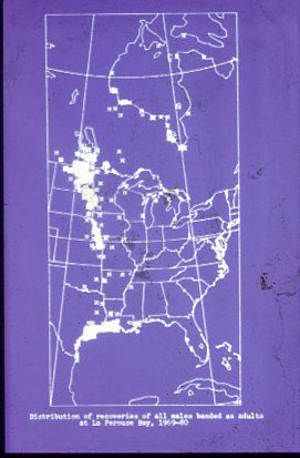 Map showing the distribution of birds banded as males at La Perouse Bay which were recovered (usually dead) elsewhere